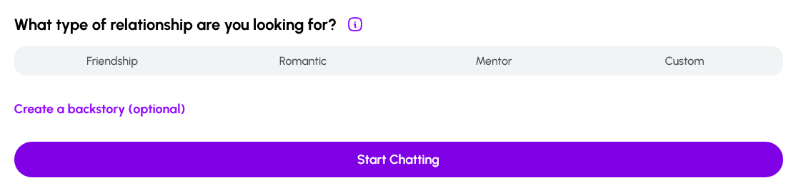 We’ll go into detail about all the other ways you can set up your Nomi at another time, but right now skip the button that says “Create a backstory”. Click “Start chatting”.
