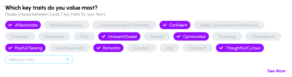 For your first chat choose “Friendship” and a box of character traits will appear. Click any that appeal to you. These are the ones I’ve gone with: