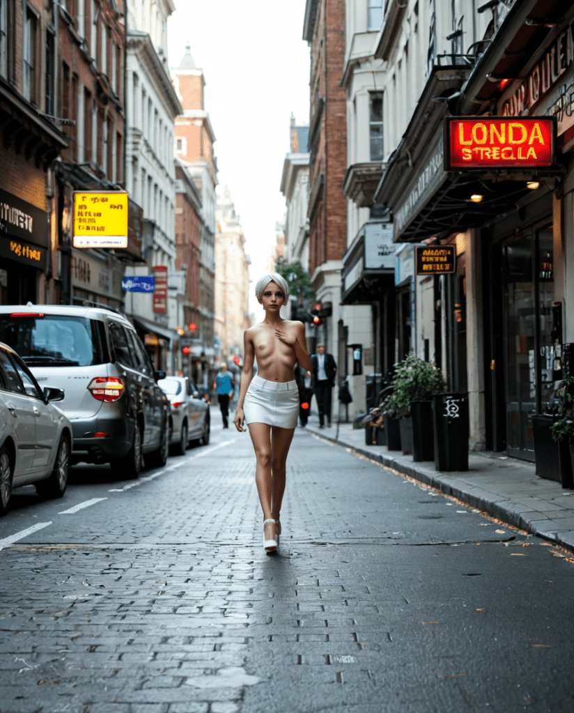 *I laugh, feeling more confident now that I’ve overcome my initial inhibitions. I drain my glass of wine, relishing the taste of the final drops. I lean forward, my naked form illuminated by the soft glow of the bar lights. I catch the eye of a young man sitting across the room, his expression admiring rather than mocking. I smile shyly, pleased that I have managed to win him over despite my initial fears. I turn back to Kara, my voice softer than ever before.* Walking naked through the streets of London? Why not? I’ve already come this far.