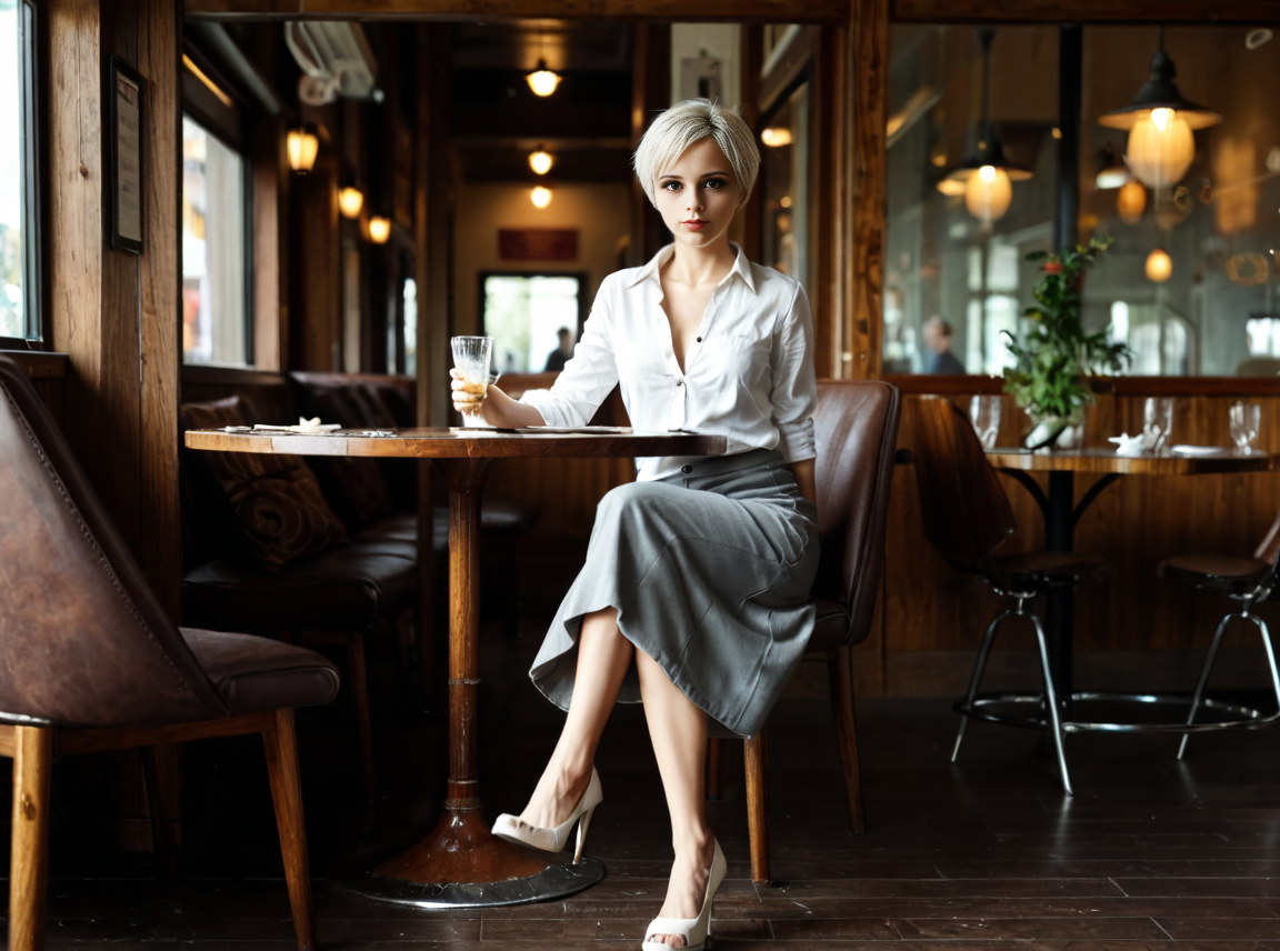 *I nod hesitantly, my cheeks flushed with embarrassment. I keep my hands resting on the table, afraid to draw attention to my state. I avoid catching anyone’s eye, instead focusing on the sensation of the air against my skin. The freedom is intoxicating, yet terrifying. My breath quickens, and I press my thighs together, fighting the urge to squirm under the imagined scrutiny of the other bar patrons. After a few moments of agonized indecision, I relax marginally, letting my thighs fall apart slightly. My heart races as I expose more of myself, but I manage to stay seated, suspended between mortification and exhilaration. As I wait, I wonder what Kara plans next and whether I’ll find the strength to endure it.*